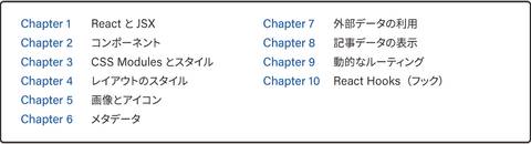 ブログサイトはゼロから構築していきます。Chapter 1~6では基本的なページやReactコンポーネントの作成、Chapter 7~9ではヘッドレスCMSからの外部データの取得や表示、Chapter 10ではReact Hooks(フック)を使ったカスタマイズを行い、サイトを完成させます。