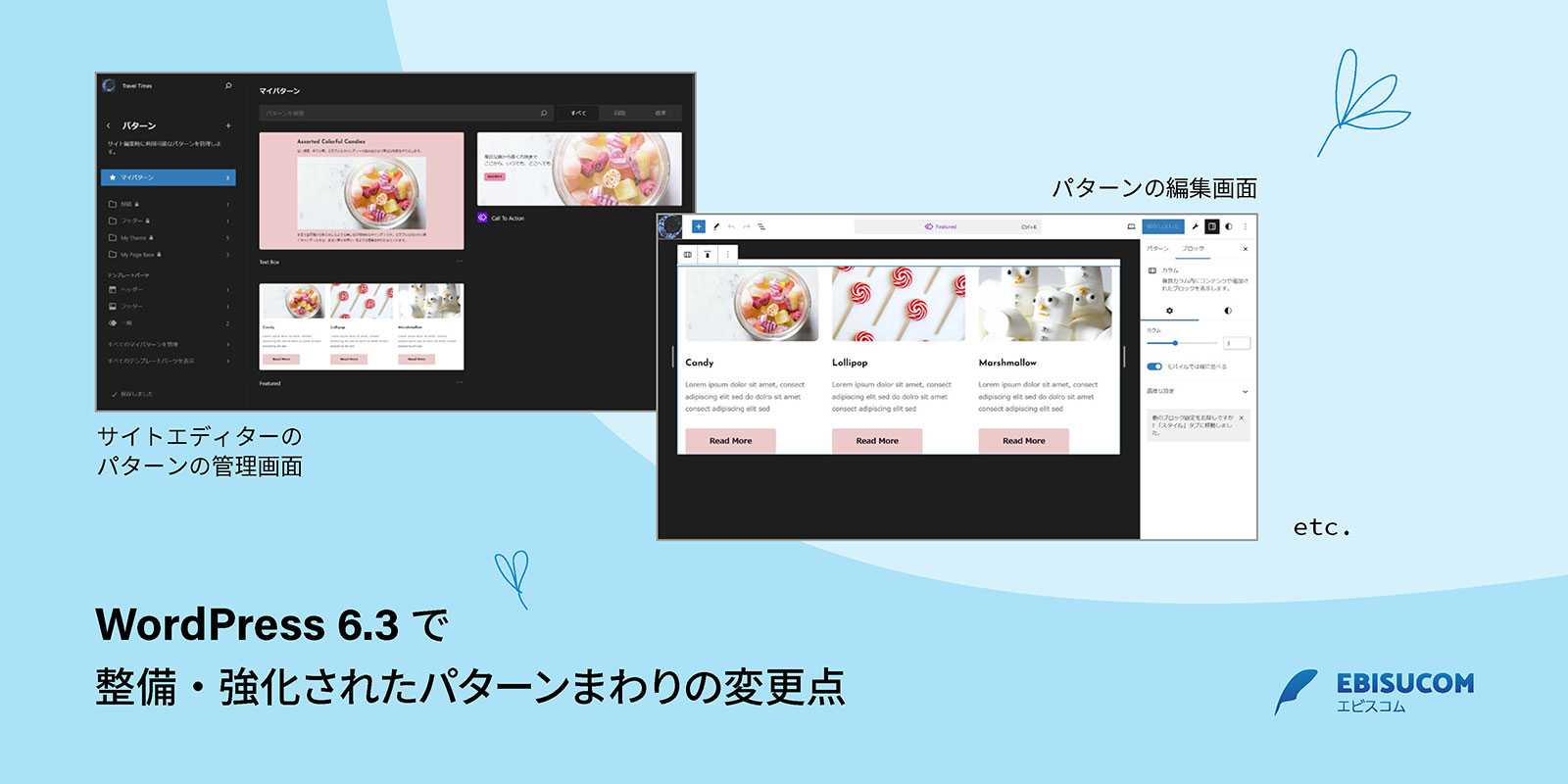 WordPress 6.3 では、サイトエディターのインターフェースやパターンまわりの機能が変わっています。これらに加えて、theme.json を元…