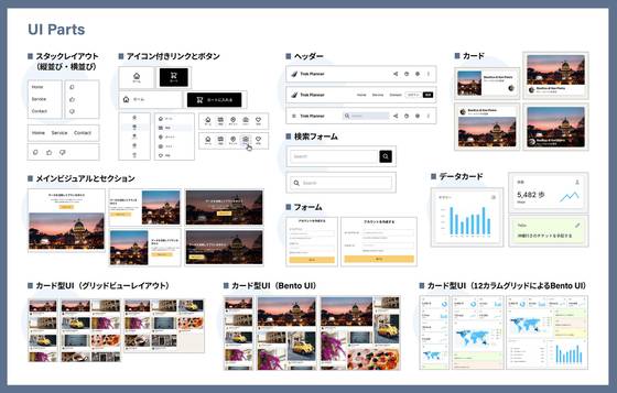 アプリやページで使用される各種UIパーツも CSS Grid で構築し、組み合わせて利用しています。