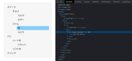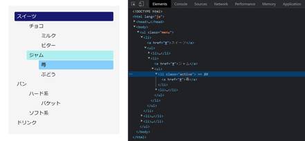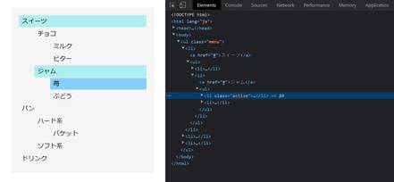 1階層のシンプルなものや、以下のような構成でも、アクティブなものだけにスタイルを当てるのであれば、それほど難しくはありません。