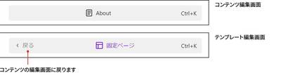 なお、コンテンツ編集画面ではページのタイトルが、テンプレート編集画面ではテンプレート名が画面上部に表示されます。テンプレート編集画面からコンテンツ編集画面へ戻ることも可能です。
