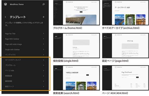 WordPressでは定番の、トップページ(ブログホーム)、アーカイブ、個別投稿、固定ページ、検索結果、404ページのテンプレートが用意されていることがわかります。トップページ(home.html)はビジネスサイトのデザインになっています。