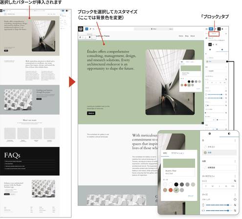 選択したパターンがページに挿入されますので、あとはパターンを構成しているブロックを選択して、テキストや画像を編集したり、設定サイドバーの「ブロック」タブで色やフォントを変えるなどしてカスタマイズしていきます。