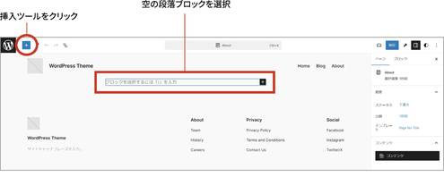 テンプレートが入れ替わったら、あとはどんなコンテンツにするかです。コンテンツエリアに用意された空の段落ブロックを選択して、挿入ツール(インサーター)の「+」アイコンをクリックします。