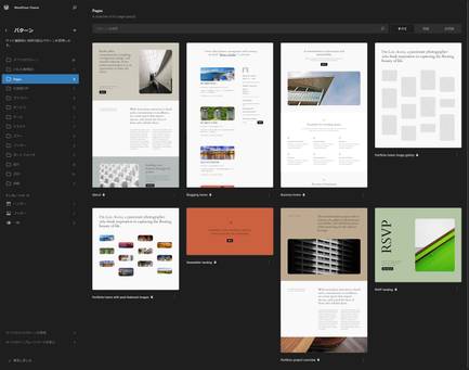 「Pages」カテゴリーを選択すると、フルページパターンが表示されます。文字通り、ヘッダーとフッターを除いた、ページ全体を構成するパターンです。