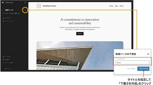 サイトエディターで「固定ページ」を開き、「+」ボタンをクリックして新規ページを作成します。ページタイトルは「About」と指定し、「下書きを作成」をクリックします。