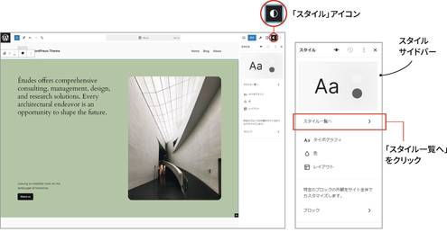 なお、ページに挿入した個々のブロック単位ではなく、サイト全体に反映させたいスタイル(グローバルスタイル)は、スタイルサイドバーでカスタマイズします。